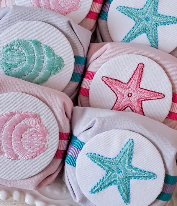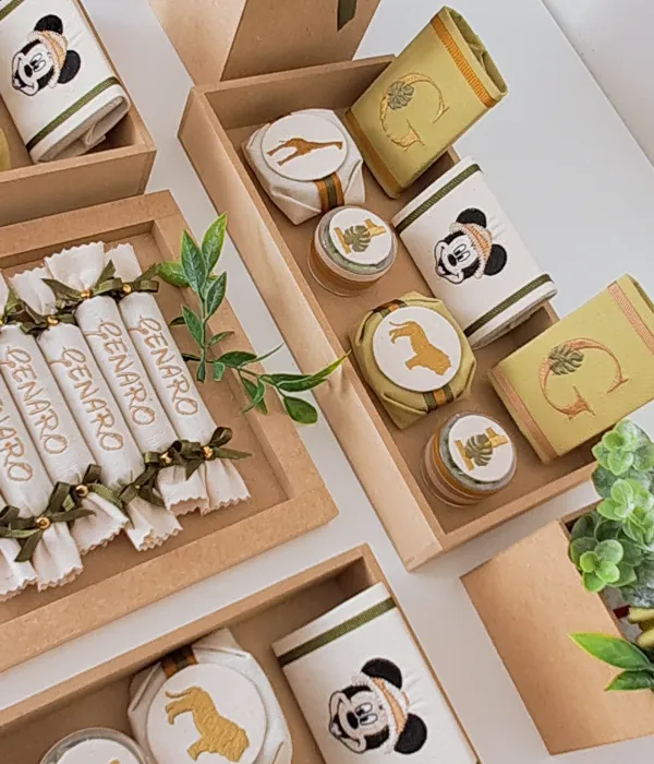 Cada golosina es intervenida con envoltorios de tela confeccionados y bordados a mano, logrando un detalle único que destaca en cualquier evento.