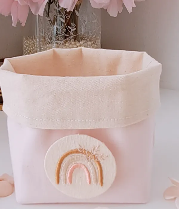 Souvenirs confeccionados en gabardina de colores con botón bordado personalizado. Una opción práctica, estética y perfecta para cualquier evento.